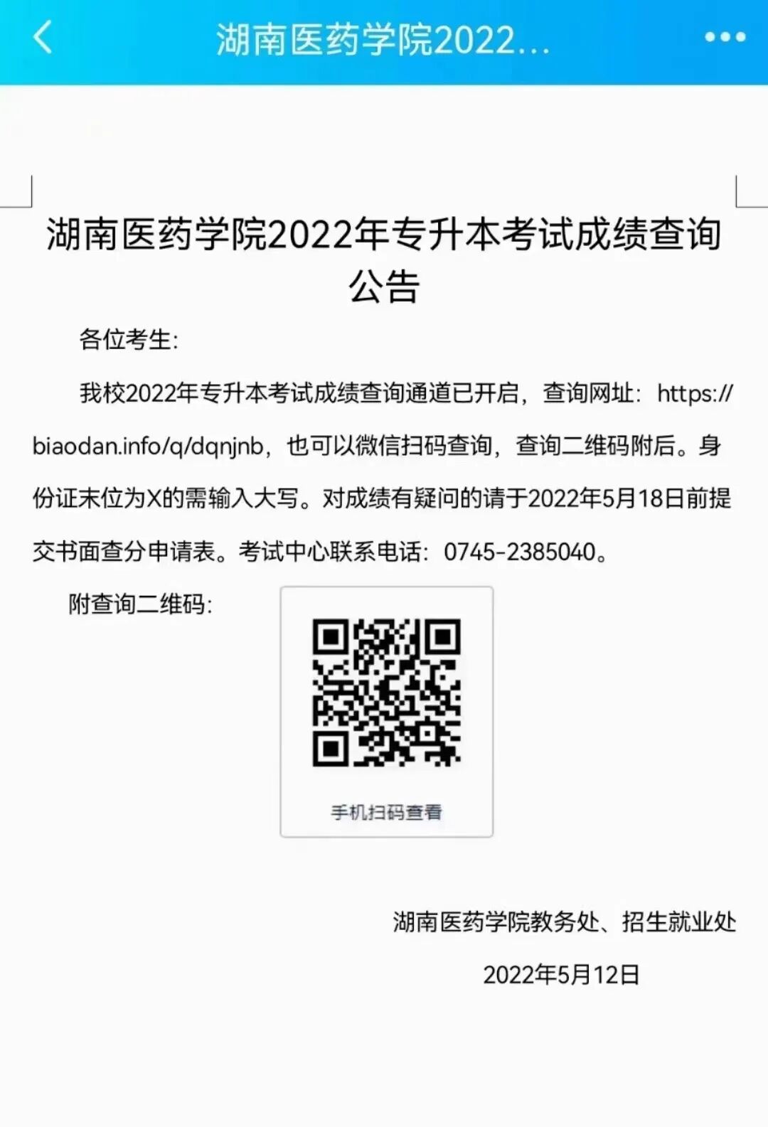 我校2022年专升本考试成绩查询通道已开启,查询网址: https://biaodan.info/q/dqnjnb,也可以微信扫码查询,查询二维码附后。身份证末位为X的需输入大写。对成绩有疑问的请于2022年5月18日前提交书面查分申请表。考试中心联系电话:0745-2385040。