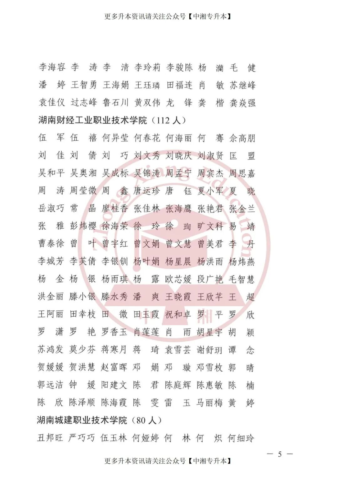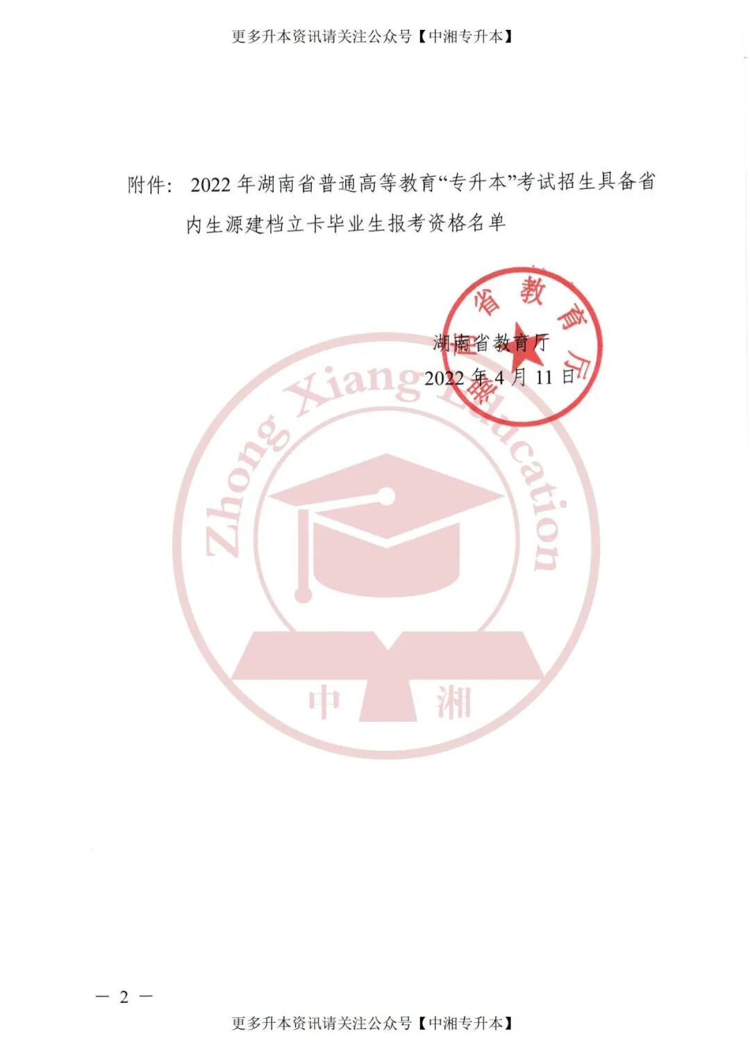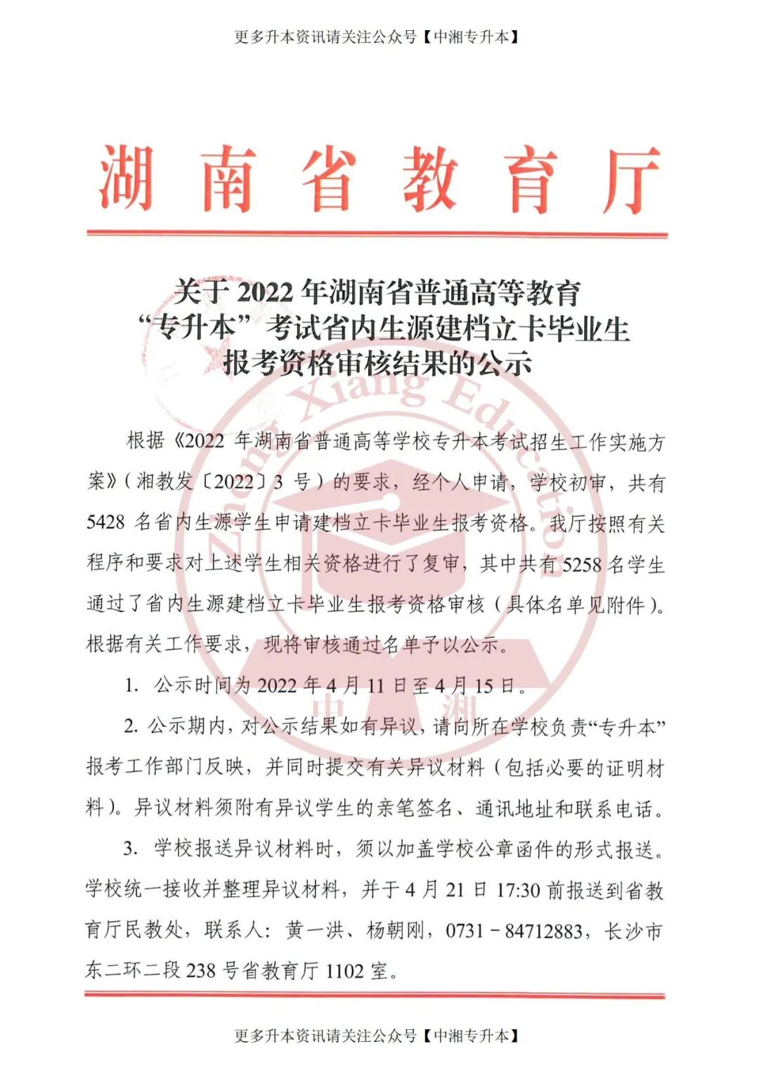 根据《2022年湖南省普通高等学校专升本考试招生工作实施方案》(湘教发〔2022〕3号)的要求,经个人申请,学校初审,共有5428名省内生源学生申请建档立卡毕业生报考资格。我厅按照有关程序和要求对上述学生相关资格进行了复审,其中共有5258名学生通过了省内生源建档立卡毕业生报考资格审核(具体名单见附件)。根据有关工作要求,现将审核通过名单予以公示。