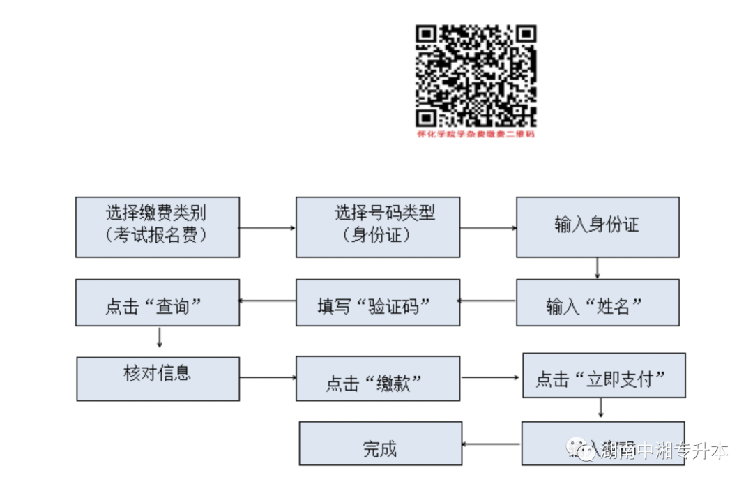 (二)缴费时间:报名截止后两周内完成缴费(4月8号前完成)。具体方法为:专升本考试报名费采用微信、支付宝扫码(怀化学院学杂费缴费二维码)收费,到时系统将自动关闭不能再缴费,需要缴纳专升本考试费的同学在缴费期间内按下面步骤缴费。